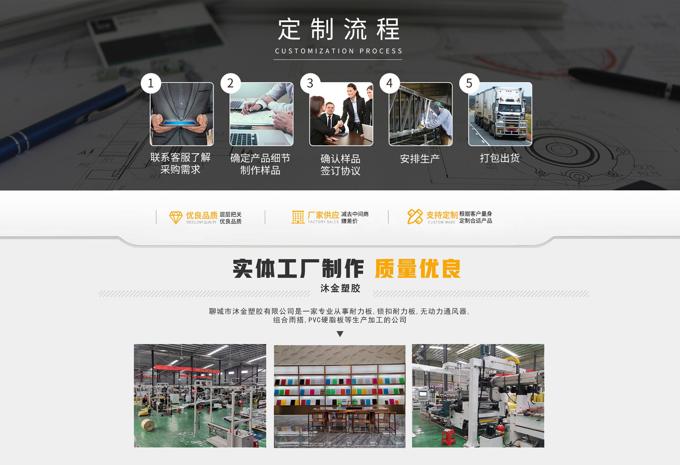 聊城市沐金塑膠有限公司注冊資金2180萬元,占地20000余平方,擁有自建廠房15000平方,員工100余名。10余年來,公司主營耐力板,鎖扣耐力板,耐力板深加工,無動力通風器,組合雨搭,PVC硬脂板,耐力板廠家等板材的發展戰略,逐漸成長為綜合性企業。 公司擁有多條板材共擠生產線,采用世界知名品牌進口原材料和先進工藝,依據完善的ISO9001質量管理體系和ISO14001環境管理體系,為產品的卓越品質提供了強有力的保證。憑借過硬的創新能力和堅實的硬件基礎,贏創已成為國內領先的熱塑性板材生產商,產品被廣泛應用于建筑業、農業、工業、廣告業、安防行業及DIY領域?! 」臼冀K致力于通過提供最優的板材應用解決方案,為客戶創造最高的價值;堅守創新、質量、靈活、服務和速度的核心價值觀;堅持“完美的產品需要完美服務的支持”的經營理念,努力實現成為世界領先的板材與解決方案供應商的夢想。 在未來,公司將立足客戶需求,不斷改變和完善現有產品,拓展產品線和充分開發板材的應用領域,為客戶創造全方位的價值。同時更好地實現員工的價值,實現公司團隊的價值。我們將與您一起創贏未來! 企業使命:成為世界領先的板材與解決方案供應商。 公司愿景:通過提供最優的板材應用解決方案,為客戶創造最高的價值。 核心價值觀:質量...